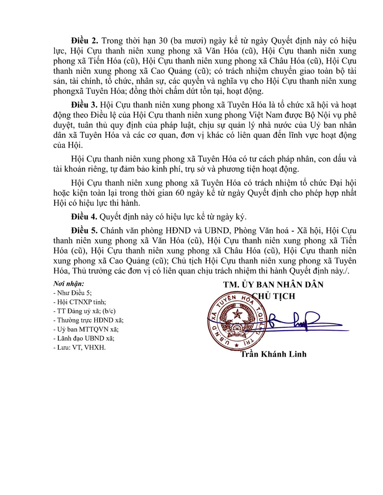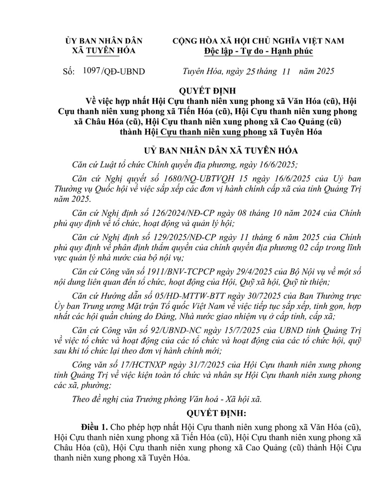 Quyết định hợp nhất Hội Cựu TNXP xã Văn Hóa (cũ), Hội Cựu TNXP xã Tiến Hóa (cũ), Hội Cựu TNXP xã Châu Hóa (cũ), Hội Cựu TNXP xã Cao Quảng (cũ) thành Hội Cựu TNXP xã Tuyên Hóa