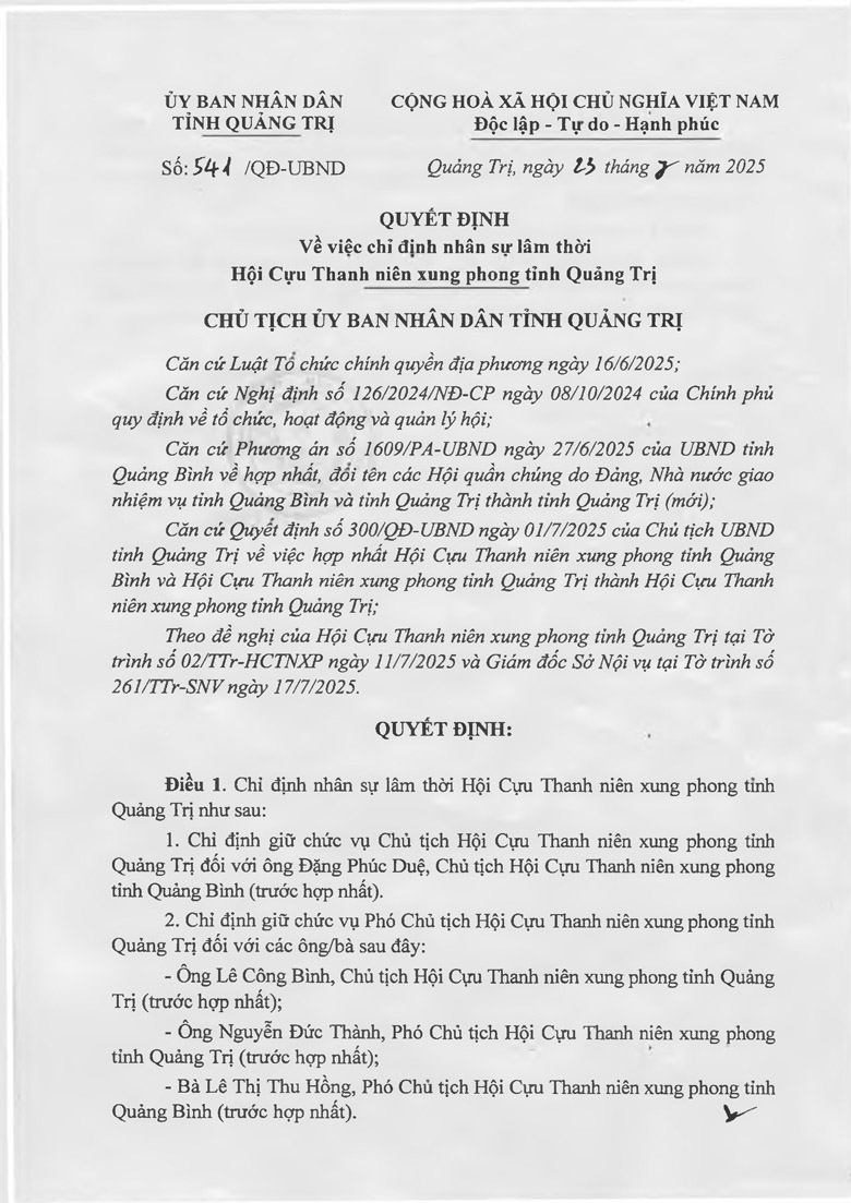 Quyết định về việc chỉ đinh nhân sự lâm thời Hội Cựu TNXP tỉnh Quảng Trị