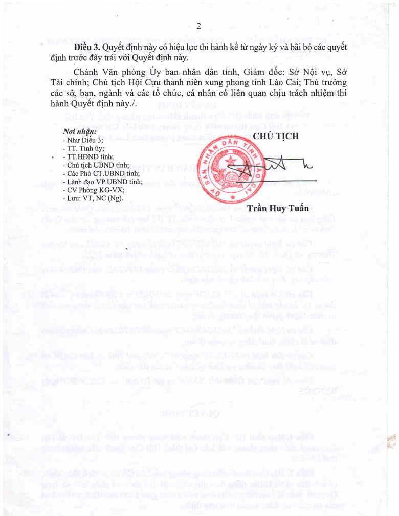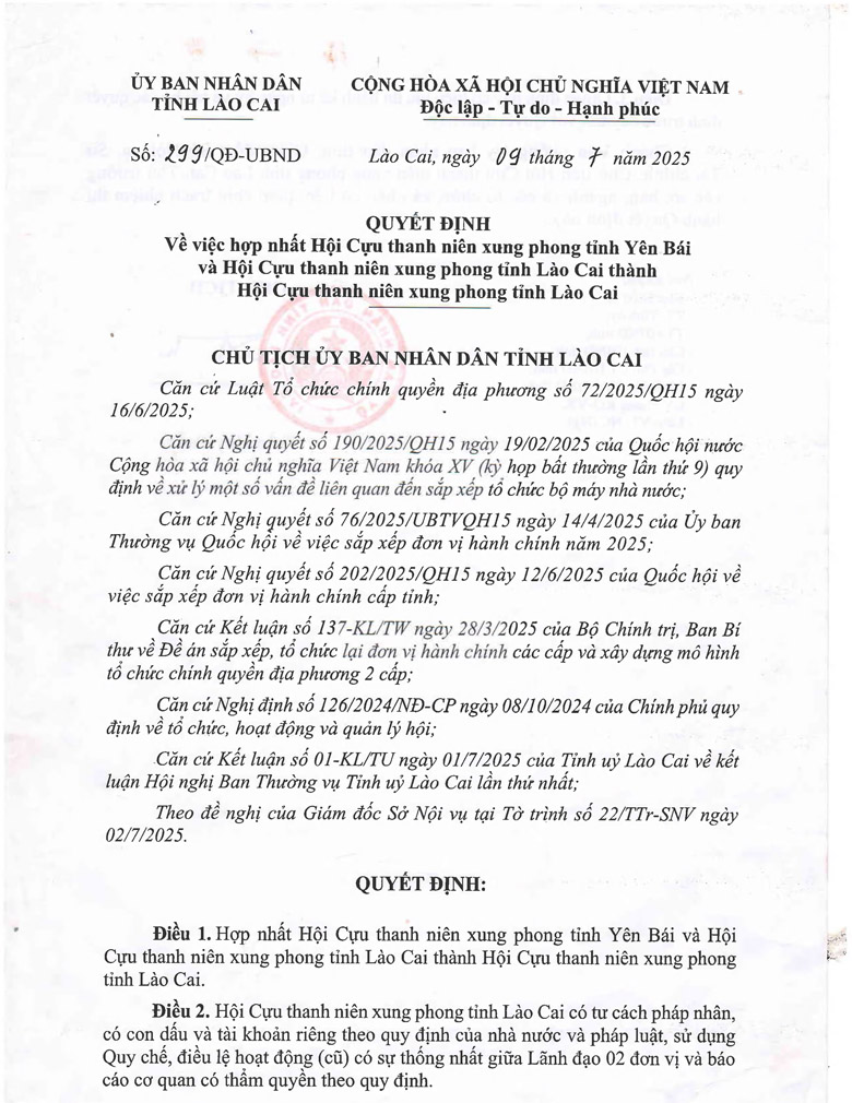 Quyết định về việc hợp nhất Hội Cựu TNXP tỉnh Yên Bái với Hội Cựu TNXP tỉnh Lào Cai