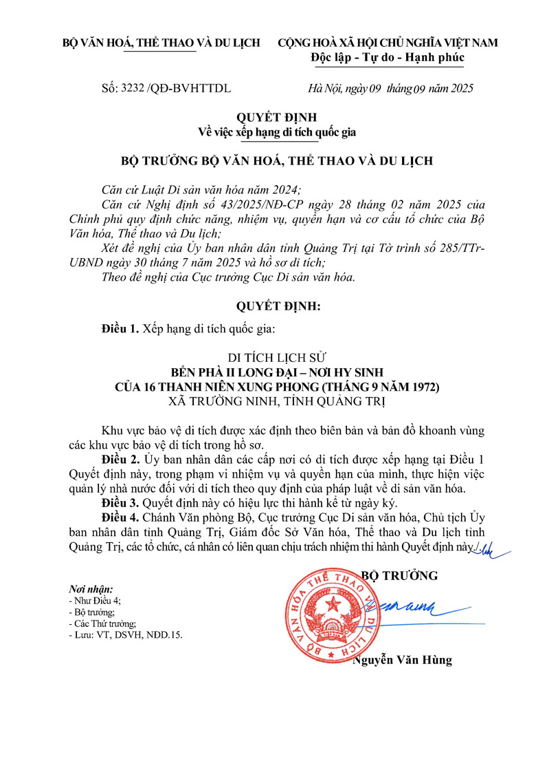 Quyết định xếp hạng Di tích Quốc gia Di tích lịch sử Bến phà II Long Đại – nơi hy sinh của 16 TNXP (tháng 9 năm 1972) xã Trường Ninh, tỉnh Quảng Trị