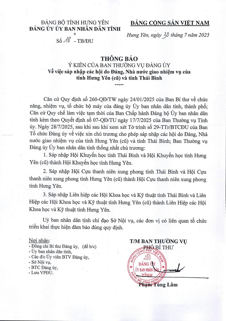Thông báo ý kiến của Ban Thường vụ Đảng ủy UBND tỉnh Hưng Yên về việc sáp nhập các hội do Đảng, Nhà nước giao nhiệm vụ của tỉnh Hưng Yên (cũ) và tỉnh Thái Bình